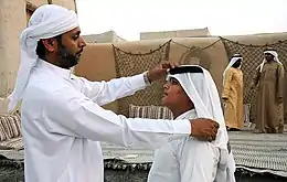 ![]() أب عربي إيراني يصلح عقال ابنه، جزيرة كيش. | ||