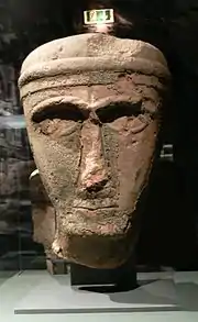 تمثال لرجل من حضارة لحيان العربية في السعودية معتمرا العقال العربي وعلى رأسه غطاء يشبه نقوش الشماغ/الكوفية.