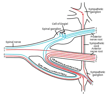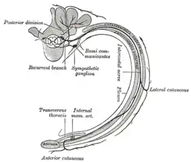 ![]() مخطط لمسار وتفرعات عصب بين ضلعي قياسي. العقدة الودية ظاهرة في المركز العلوي. مخطط لمسار وتفرعات عصب بين ضلعي قياسي. العقدة الودية ظاهرة في المركز العلوي. | |