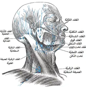 ![]() الغدد اللمفاوية السطحية والأوعية اللمفاوية في الرأس والعنق. الغدد اللمفاوية العميقة السفلية تظهر بالأسفل على اليمين. الغدد اللمفاوية السطحية والأوعية اللمفاوية في الرأس والعنق. الغدد اللمفاوية العميقة السفلية تظهر بالأسفل على اليمين. | |