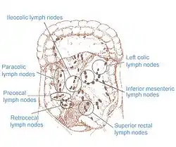 ![]() النزح اللمفاوي للقولون (المساريقي السفلي في أسفل منتصف الصورة) النزح اللمفاوي للقولون (المساريقي السفلي في أسفل منتصف الصورة) | |
