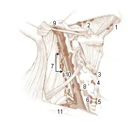 ![]() عقد لمفية عميقة 1. تحت الذقن 2. تحت الفك السفلي عقد لمفية رقبية أمامية (عميقة) 3. أمام الحنجرة 4. درقية 5. أمام الرغامى 6. مجاور للرغامى عقد لمفية رقبية عميقة علوية 7. وداجية وحشية 8. وداجية أمامية 9. وداجية ذات بطنين عقد لمفية رقبية سفلية 10. وداجية لامية كتفية 11. فوق الترقوة عقد لمفية عميقة 1. تحت الذقن 2. تحت الفك السفلي عقد لمفية رقبية أمامية (عميقة) 3. أمام الحنجرة 4. درقية 5. أمام الرغامى 6. مجاور للرغامى عقد لمفية رقبية عميقة علوية 7. وداجية وحشية 8. وداجية أمامية 9. وداجية ذات بطنين عقد لمفية رقبية سفلية 10. وداجية لامية كتفية 11. فوق الترقوة | |
