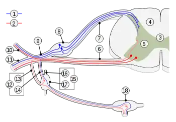 جذور العصب الشوكي: 6- بطني. 7- ظهري، 8- عقدة الجذر الظهري. 9- عصب شوكي.