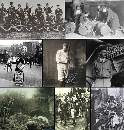 - البدء بحظر الكحول في الولايات المتحدة يوم 16 يناير 1919 بالتصديق على التعديل الثامن عشر لدستور الولايات المتحدة والذي بدأ سريانه من 17 يناير 1920، واستمر طوال عقد العشرينيات حتى ألغي الحظر سنة 1933. وتحولت الجريمة المنظمة إلى تهريب وتعبئة الخمور بقيادة شخصيات مثل آل كابوني زعيم مافيا شيكاغو.