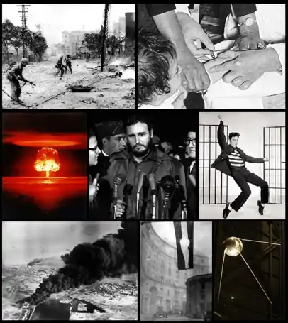 الأسفل (من اليسار لليمين): تصاعد أعمدة الدخان من خزانات النفط في بور سعيد في أعقاب شن كل من إسرائيل والمملكة المتحدة وفرنسا عدوانًا عسكريًا ثلاثيًا على مصر في أواخر عام 1956، القوات المظلية الفرنسية تسير في مدينة الجزائر في بداية الحرب الجزائرية الفرنسية عام 1957، الاتحاد السوفيتي يطلق "سبوتنك 1"، لتصبح أول قمر صناعي يدور حول الأرض, في شهر أكتوبر من عام 1957.