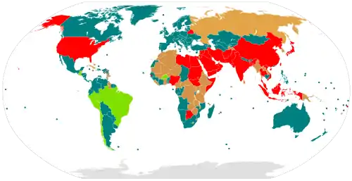 من الناحية التاريخية، استخدمت عقوبة الإعدام في كل جزء تقريبا من العالم. وفي الوقت الراهن، ألغت الغالبية العظمى من البلدان هذه الممارسة أو أوقفتها. الولايات المتحدة هي الأكثر استخداماً عقوبة الإعدام.[1][2][3][4][5][6][7] وينقسم استخدام عقوبة الإعدام عادة إلى الفئات الأربع المبينة أدناه. اعتبارا من 11 نيسان / أبريل 2017، من بين الدول المستقلة البالغ عددها 195 دولة التي هي الدول الأعضاء في الأمم المتحدة أو لديها مراقبون في الجمعية العامة للأمم المتحدة :[8]