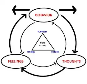 ![]() يمثل المثلث الموجود في المنتصف مبدأ العلاج المعرفي السلوكي القائل بأن جميع المعتقدات الأساسية للبشر يمكن تلخيصها في ثلاث فئات: الذات self، والبعض الآخر others، والمستقبل future. | |