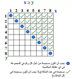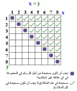 | ن | الكل | متعدية | انعكاسية | ترتيب مسبق (preorder) | ترتيب جزئي | ترتيب مسبق كلي (total preorder) | ترتيب كلي | علاقة تكافؤ |