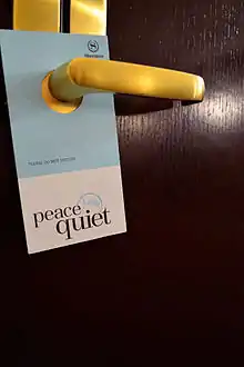 واحد من الأماكن الشائعة جداً التي تستخدم فيها إشارة "عدم الإزعاج" هي الفنادق، حيث يضع النزلاء هذه الإشارة لإبلاغ العاملين لاحترام خصوصيتهم.[1] وبعض الفنادق الأخرى توفر إشارات "تنظيف الغرفة" والتي هي بالمعنى المعاكس.