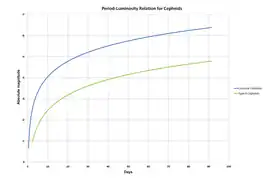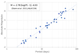 () تقاس بالأيام،[17][14] تستخدم هذه العلاقة أيضاً لحساب بُعد هذه النجوم.
