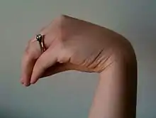 إذ ينعطف المعصم و المفاصل السنعية السلامية، بينما تنبسط المفاصل بين السلامية، أما الأصابع سوف تقترب نحو المحور الرئيسي.