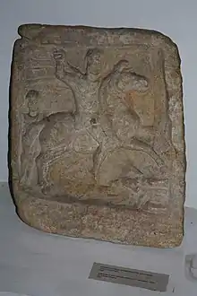 فارس ثراسيان في المتحف التاريخي الوطني في بلغاريا-عبادة "الفارس التراقي" انتشرت على جزء كبير من البلقان خلال الفترة الرومانية.