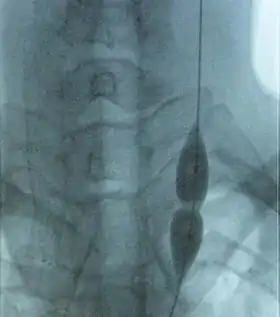 ![]() توسيع بالبالون لوريد وداجي غائر متضيق (أخذت الصورة بواسطة مراقب تصوير الأوعية بالأشعة السينية). رغم أن الضغط في البالون منخفض نسبيا، فإن التضيق يمنع البالون من التوسع في الوسط. زيادة الضغط ستوسع مكان التضيق وتسمح للدم بالجريان. | |