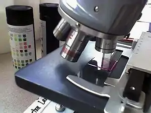 بالنسبة للمجهر الخفيف، يوضع سكين فولاذي في مبضع الفحص المجهري الذي يستخدم لقطع شرائح من الأنسجة سمكها 10 - ميكرومتر والتي توضع علي شريحة الميكروسكوب الزجاجية. لاستعمال مجهر الإرسال الإلكتروني، توضع سكين من الماس في جهاز قطع الشرائح الرقيقة جدا من النسيج تستخدم لقطع شريحة من النسيج سمكها 50 - نانومتر والتي تقام على شبكة نحاسية قطرها 3 - ملم. ومن ثم تعالج الاقسام بالبقع المناسبة.