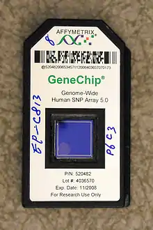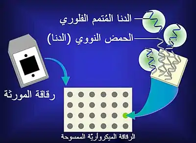 هناك أيضا وحدات ميكروأراي تستخدم آلية التهجين للقيام بتشخيص السرطان. يمكن تركيب أكثر من مليون من المجسات المختلفة على مصفوفة مع تقنية Genechip من Affymetrix مع حد كشف من 1-10 نسخ من mRNA لكل بئر (بئر: وحدة حيز من المكان على الشريحة).[20] تعتبر وحدات ميكروأراي الدقيقة المحسنة قادرة بالعادة على تقديم نتائج تحديد كمية قابلة للتكرار لأهداف مختلفة.[47] في الوقت الحالي، وافقت إدارة الأغذية والأدوية FDA بالفعل على عدد من فحوصات التشخيص التي تستخدم المصفوفات الدقيقة ميكروأراي: يمكن لمقايسات MammaPrint من Agendia أن تخبر خطر تكرار سرطان الثدي عن طريق تمييز التعبير عن 70 جينة مرتبطة بسرطان الثدي ؛ [48] يمكن لفحص "Autogenomics INFNITI CYP2C19" توصيف الأشكال الجينية، التي تؤثر على الاستجابة العلاجية لمضادات الاكتئاب بشكل كبير ؛ [49] ويمكن لـ CytoScan Dx من Affymetrix تقييم الإعاقات الذهنية والاضطرابات الخلقية عن طريق تحليل طفرة الكروموسومات.[50]