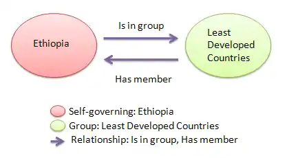 - تعرّفالفئة بأنها مجموعة من الأفراد الذين يشتركون في خواصّهم العامة. حيث تعرّف إثيوبيا - كما يوضحها الشكل 1, – وهي شيء من العالم الحقيقي، مثلاً بأنها فرد. وقد جرى التعبير عن الخواص المشتركة بين الأفراد (إثيوبيا وجمهورية كوريا وإيطاليا الخ...) وذلك من خلال تحديد فئة سمّيت الشكل 1, وهكذا فان الدائرة الوردية اليسرى في الشكل تبين فئة البلدان التي "تحكم ذاتياً " وأن "إثيوبيا" فرد يقع ضمن فئة البلدان التي "تحكم ذاتياً". ". كما تبين الدائرة الخضراء اليمنى " فئة" تجمّع وأن "البلدان الأقل نمواً" is an " فرد يقع ضمن "فئة ".