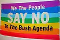 علم قوس قزح بشعار "نحن الناس نقول لا لأجندة بوش" استخدم في الاحتجاج بالولايات المتحدة ضد سياسة بوش بعد أحداث 11 سبتمبر