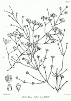 النبات شجيرة معمرة خضراء زيتونية اللون، يبلغ ارتفاعها حوالي المتر وتتكون من عدد كبير من السوق الاسطوانية المفصلية الرفيعة عديمة الأوراق كأنها عصي، (فالأوراق مختزلة). النبات أحادي المسكن حيث تكون الأزهار الذكرية صفراء والأنثوية خضراء. تزهر في شهر آذار وتتكون البذور في شهر نيسان.