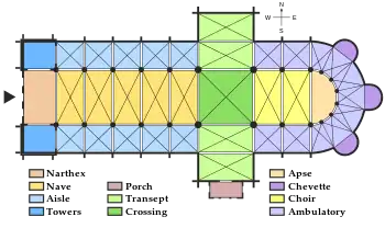 كان مخطط الكاتدرائيات والكنائس القوطية مبنيًا على مخطط الصليب اللاتيني (أو "الصليب") المأخوذة من البازيليكا الرومانية القديمة. [55]ومن كنائس الرومانيسك اللاحقة.وكان لديهم صحن طويل يصنع جسد الكنيسة؛ وذراع تحميل عرضية تسمى ترانسبت، وخلفها إلى الشرق، الجوقة، والمعروفة أيضًا باسم المذبح أو الكاهن، والتي كانت عادةً مخصصة لرجال الدين. تم تقريب الطرف الشرقي للكنيسة في الكنائس الفرنسية، واحتلت العديد من الكنائس المشعة، مما سمح بإقامة احتفالات متعددة في وقت واحد. في الكنائس الإنجليزية، كان الطرف الشرقي يحتوي أيضًا على كنائس صغيرة، ولكنه كان مستطيلًا في العادة. هناك ممر يسمى أمبلوتري يدور حول الجوقة. سمح هذا لاعضاء الأبرشية، وخاصة الحجاج، بالسير عبر المصليات لرؤية الآثار المعروضة هناك دون إزعاج الخدمات الأخرى الجارية. [56]