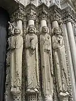 تمت إزالة العديد من التماثيل في نوتردام، ولا سيما الجروتسك، من الواجهة في القرنين السابع عشر والثامن عشر، أو تم تدميرها خلال الثورة الفرنسية. تم استبدالهم بأشكال على الطراز القوطي، صممها يوجين فيوليت لو دوك خلال ترميم القرن التاسع عشر.[61] تظهر شخصيات مماثلة في الكنائس القوطية الرئيسية الأخرى في فرنسا وإنجلترا.