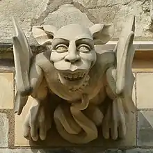 بجانب القديسين والرسل، تم تزيين واجهات الكنائس القوطية بمنحوتات لمجموعة متنوعة من الوحوش أو الوحوش الرائعة والمخيفة. وشمل ذلك الكيميرا، وهو مخلوق أسطوري هجين كان عادة ما يكون له جسد أسد ورأس ماعز، وستريكس أو ستريج، وهو مخلوق يشبه البومة أو الخفاش، ويقال إنه يأكل لحم الإنسان. ظهر الستريكس في الأدب الروماني الكلاسيكي. وصفه الشاعر الروماني أوفيد، الذي كان يُقرأ على نطاق واسع في العصور الوسطى، بأنه طائر كبير الرأس بعيون ثابتة ومنقار جشع وأجنحة بيضاء رمادية. [59] [مصدر أفضل مطلوب] كانوا جزءًا من الصورة المرئية. رسالة للمصلين الأميين، رموز للشر والخطر الذي هدد من لم يتبع تعاليم الكنيسة. [60]