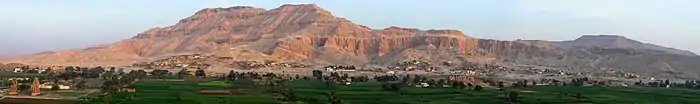 يوجد وادي الملوك خلف الجبال العالية إلى اليمين.