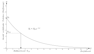 تحلل أسي لمادة مع الزمن . كمية المادة في الأصل ( 0 )N وكميتها عندما يتحلل النصف ( 1/2 )N ؛ المحور الأفقي يبين الزمن.