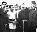بطل رفع الإثقال الفلسطيني عيسى الطمس في لقطة يتسلم فيها الكأس من الرئيس العام لحراسة الأراضي المقدسة 1953