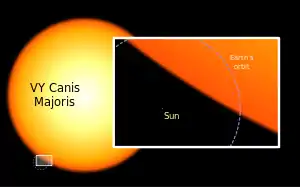 - في واي الكلب الأكبر ويبلغ قطره بين 1800 إلى 2100 مرة أكبر من قطر الشمس، ويعتبر أكبر النجوم المعروفة، ويبلغ ضياؤه أشد من ضياء الشمس 500.000 مرة.