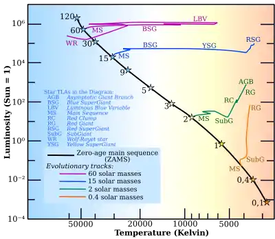 يتبع تطور النجم إذا كانت كتلته نحو 2 كتلة شمسية (كما في الشكل) الخط الأخضر في هذا المخطط، وتسمى مسيرته هذه مسيرة عملاق أحمر، لهذا تسمى تلك المسيرة "فرع عملاق مقارب " asymptotic giant branch أو مختصرا AGB. وجميع النجوم التي تصل خلال عمرها تلك المرحلة تسمى AGB stars.