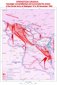 في 07:20 بتوقيت موسكو في 19 نوفمبر، بدأت القوات السوفيتية هجومها على الأجناب الشمالية لقوات المحور في ستالينجراد؛ بدأ الهجوم في الجنوب في 20 نوفمبر. ومع أن القوات الرومانية تمكنت من صد الهجمات الأولى، وبحلول نهاية يوم 20 نوفمبر، كان الجيشان الثالث والرابع الرومانيان في انسحاب كامل، فيما تقدمت القوات السوفيتية متخطية عدة فرق مشاة ألمانية. ولم تكن قوات الاحتياط النقالة الألمانية قادرة على صد رؤوس الجسور المؤللة التي أقامها السوفيت، حيث لم يتوفر لدى الجيش السادس الرد السريع أو الحزم الكافي لرفع الضغط عن القوات المدرعة الألمانية في ستالينجراد وإعادة توجيه هذه القوات لهزيمة التهديد المحدق بالمحور.