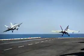 ![]() الطائرة الأمريكية الحربية إف\أيه-18إي\إف سوبر هورنت من السرب فا-22 تقلع من يو إس إس كارل فينسن لدعم جهود الولايات المتحدة لعملية العزم الصلب في أكتوبر 2014. | |||||||