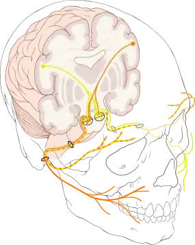 - العصب الدمعي - ينقل الإحساس إلى مناطق الجلد في المنطقة المدارية الجانبية (محجر العين)، باستثناء الغدة الدمعية.