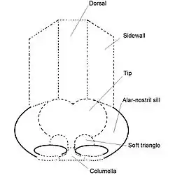 يتم تكوين شكل الوحدات الفرعية الأنفية - الظهر، والجدران الجانبية، والفصيص، والمثلثات الرخوة، والعلوية، والكولوميلا - بشكل مختلف، وفقًا للعرق والمجموعة العرقية للمريض، وبالتالي يتم تصنيف ملامح الأنف على النحو التالي: أفريقي، بلاتيررين (مسطح، أنف عريض)؛ الآسيوية، subplatyrrhine (منخفضة، واسعة الأنف)؛ قوقازي، ليبتورين (أنف ضيق)؛ واللاتينية، paraleptorrhine (أنف ضيقة الجوانب). يعتمد الصمام الخارجي الخاص بكل أنف بشكل متغير على حجم وشكل وقوة الغضروف الجانبي السفلي. [22]