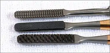 أدوات تجميل الأنف: عظم العظم (إزميل العظام) ومطرقة جراحية لنحت العظام القحفية الوجهية.