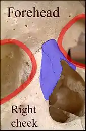 - القسم الثالث الأوسط - الجلد الذي يغطي جسر الأنف (القسم الأوسط الظهري) هو أنحف، وأقل قابلية للتمدد، جلد الأنف، لأنه يلتصق بشكل أكبر بهيكل الدعم.