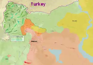 ![]() سيطرة المعارضة المدعومة تركياً سيطرة كردية سيطرة الجيش السوريللاطلاع على خريطة تفاعلية محدثة أكثر تفصيلا، انظر قالب:خريطة مفصلة للحرب الأهلية السورية. | |||||||||