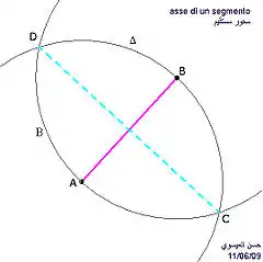 - يُوضع رأس الفرجار في النقطة A ورسم دائرة دلتا نصف قطرها أكبر من نصف المستقيم A-B؛