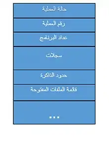 - معلومات لمُجدول المعالج المركزي : هذه المعلومات من ضمنها اولوية العملية، مؤشرات لطوابير الجدولة واية معلومات اخرى متعلقة بالجدولة.