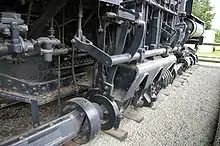The rear drive shaft, crankshaft and front drive shaft of a Shay locomotive