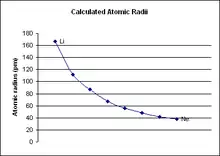 عند ازدياد العدد الذرّي لعناصر الدورة الثانية، أي عند الانتقال من اليسار لليمين على طول الدورة، فإن نصف قطر الذرّي للعناصر يتناقص، وتزداد الكهرسلبية وطاقة التأيّن.[1]
