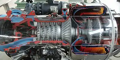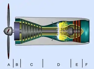 A المروحة - B صندوق التروس - C كابس - D غرفة الاحتراق - E عنفة تمديد الهواء - F العادم. ويتكون التوربين الغازي من الأجزاء C إلى E.