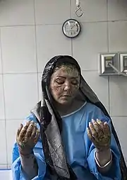 | "مريم، امرأة إيرانية تعرضت إلى هجوم بالحمض من قبل زوجها، والتقطت الصورة في إبريل 2018" |