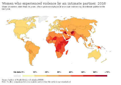في الجدول التالي تقرير منظمة الصحة العالمية الصادر في عام 2013 عن نسبة النساء اللاتي تعرضن إلى الإيذاء الجسدي والجنسي من شركائهن خلال حياتهن حسب المناطق المختلفة:[15]