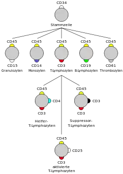 من جزيئات التمايز الشائعة الذكر كتلة التمايز 4 و CD8, والتي تستخدم كمعلمات لخلايا تي المساعدة والخلايا تي القاتلة على التوالي. تلك الجزيئات تعرف غالبا مع + CD3, كما تبدي بعض خلايا الدم الحمراء تلك الجزيئات ( بعض الماكوفاغ تظهر معدلات قليلة من CD4 ؛ بينما تبدي الخلايا المتغصنة البروتين CD8).