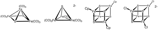 هناك عدد من الأشكال التي يمكن أن تكون عليها العناقيد، أشهرها من النمط 4Fe-4S و2Fe-2S؛ ومن الشائع أن تكون ذرة الحديد متناسقة مع مجموعات وظيفية عضوية، مثلما هو الحال في المركب C5H5)4Fe4S4).[2]