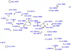ويبلغ لمعان أشد تلك المجرات سطوعا بين 12 إلى 14 قدر ظاهري مما يحتاج إلى تلسكوبات للهواة أكبر من قطر 20 سنتيمتر . ويسيطر على مركز التجمع مجرتان إهليجيتان NGC 4874 و NGC 4889. ويبعد التجمع عن القطب الشمالي بعدة درجات قوسية . وتشكل المجرات الإهليجية معظم مجرات ذلك العنقود.