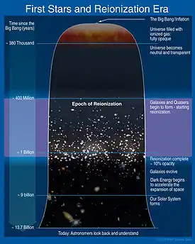 |CitationClass=تم تجاهله (مساعدة); Explicit use of et al. in:|مؤلف=(مساعدة) - Loeb and Barkana (2000). "In the Beginning: The First Sources of Light and the Reionization of the Universe". Physics Reports. 349: 125–238. doi:10.1016/S0370-1573(01)00019-9. مؤرشف من الأصل في 14 ديسمبر 2018. الوسيط