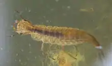 يتنوع طول الخنافس في مرحلة اليرقات، حيث يتراوح طولها من 1 إلى 5 سم (نصف بوصة إلى بوصتين). كما تأخذ أجسام اليرقات شكل هلال مع ذيل طويل ومغطاة بشعيرات رفيعة. كما تبرز ستة أرجل على طول الصدر، والتي تحتوي أيضًا علي شعيرات رفيعة. وتكون رأس الخنفساء المفترسة الغواصة مسطحة ومربعة، ومزودة بزوج من الفكوك الطويلة الواسعة. وتتشبث الخنفساء المفترسة الغواصة أثناء عملية الصيد بالأعشاب أو قطعة من الخشب بطول الجهة السفلية وتظل ساكنة تمامًا حتى تمر الفريسة وتندفع إلي الأمام وتمسكها وتظل بالقرب منها لكي تتغذى عليها حيث تضعها بين أرجلها الأمامية وتقوم بالعض باستخدام فكيها. كما تتغذى عادة علي فرائس مختلفة مثل الضفادع الصغيرة (tadpole) والديدان العشبية (glassworms) وغيرها من عشرات المخلوقات الصغيرة الأخرى التي تعيش في المياه.