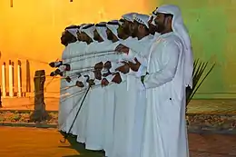 هي رقصة تؤدى بواسطة صفين متقابلين من الرجال. ويتماسك أفراد كل صف جيدا بحيث يبدون متلاصقين فيمسك كل رجل بيد الاخر ويحيط يده الأخرى بخصره وهذا يدل على التماسك والتعاون القبلي ويتوسط الصفين فرقة تتولى الموسيقى حيث يحمل أفرادها أدوات موسيقية كثيرة أغلبها نحاسي كالطبول والدفوف وغيرها، ويراس تلك الفرقة الموسيقية رجل يحمل طبلة اسطوانية الشكل ذات وجهين تسمى كاسر وهي التي تعمل على إعطاء الموسيقى الطابع الحماسي المميز للرقصة والملائم للشعر الذي يقال أثناء الرقص.